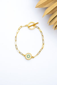 The 18K Link Floral Gemstone Bracelet features vibrant floral-shaped gemstones set in a gold-plated link chain. This bracelet combines a touch of nature-inspired beauty with a chic, versatile design, finished with a secure toggle closure.