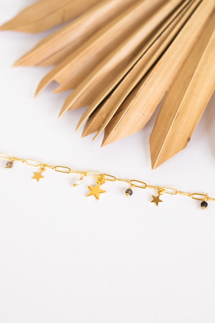 A celestial-inspired accessory featuring a gold-plated link chain accented with mixed stones, freshwater pearls, and a delicate star charm. Secured with a lobster clasp, it’s a radiant addition to any collection.