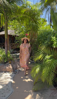 Flowy and effortless, this long caftan features delicate contrast trim and a breezy silhouette—perfect for poolside lounging or sunset strolls.