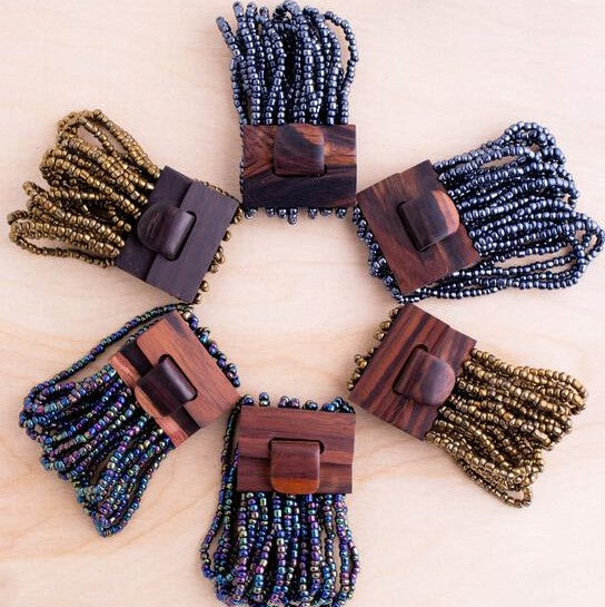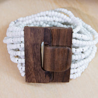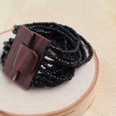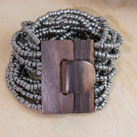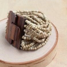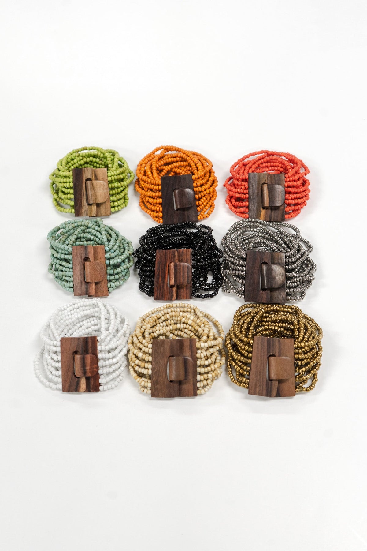 Solid Big Buck Bracelet features a stretchy design with glass beads and a wood buckle closure. This top seller offers both style and versatility in a standout accessory.