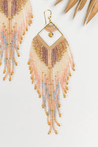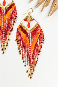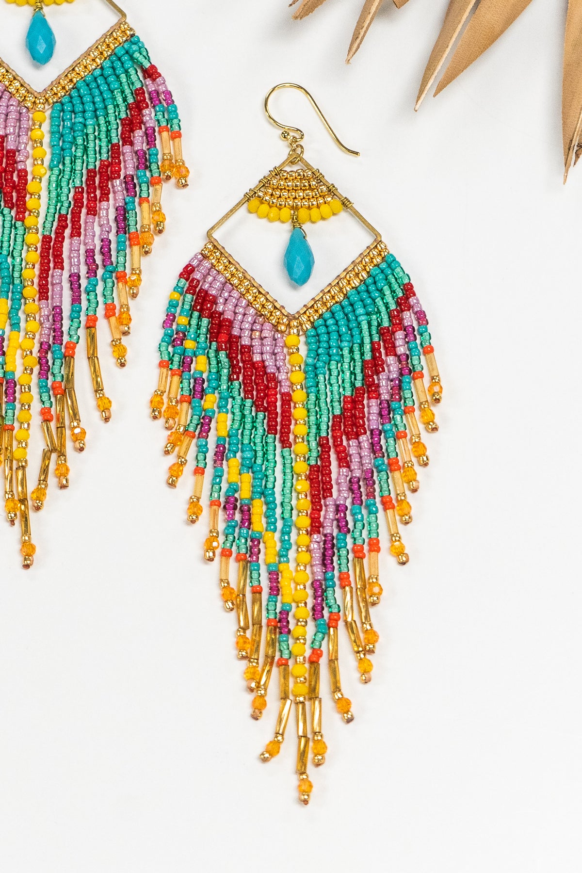 Statement fringe earrings with radiant beadwork and bold geometric detail, each pair handcrafted to bring vibrant movement and playful energy to any look.
