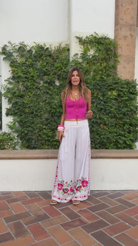 Wide leg pant featuring embroidered details and a stretch waistband for a comfortable and effortless fit.
