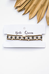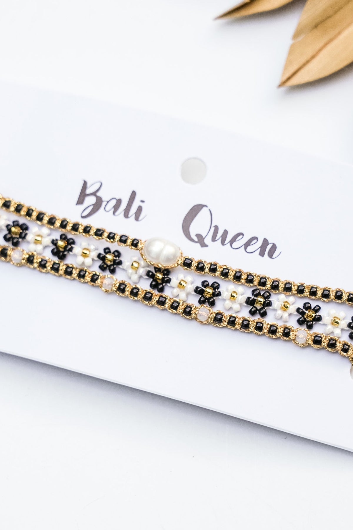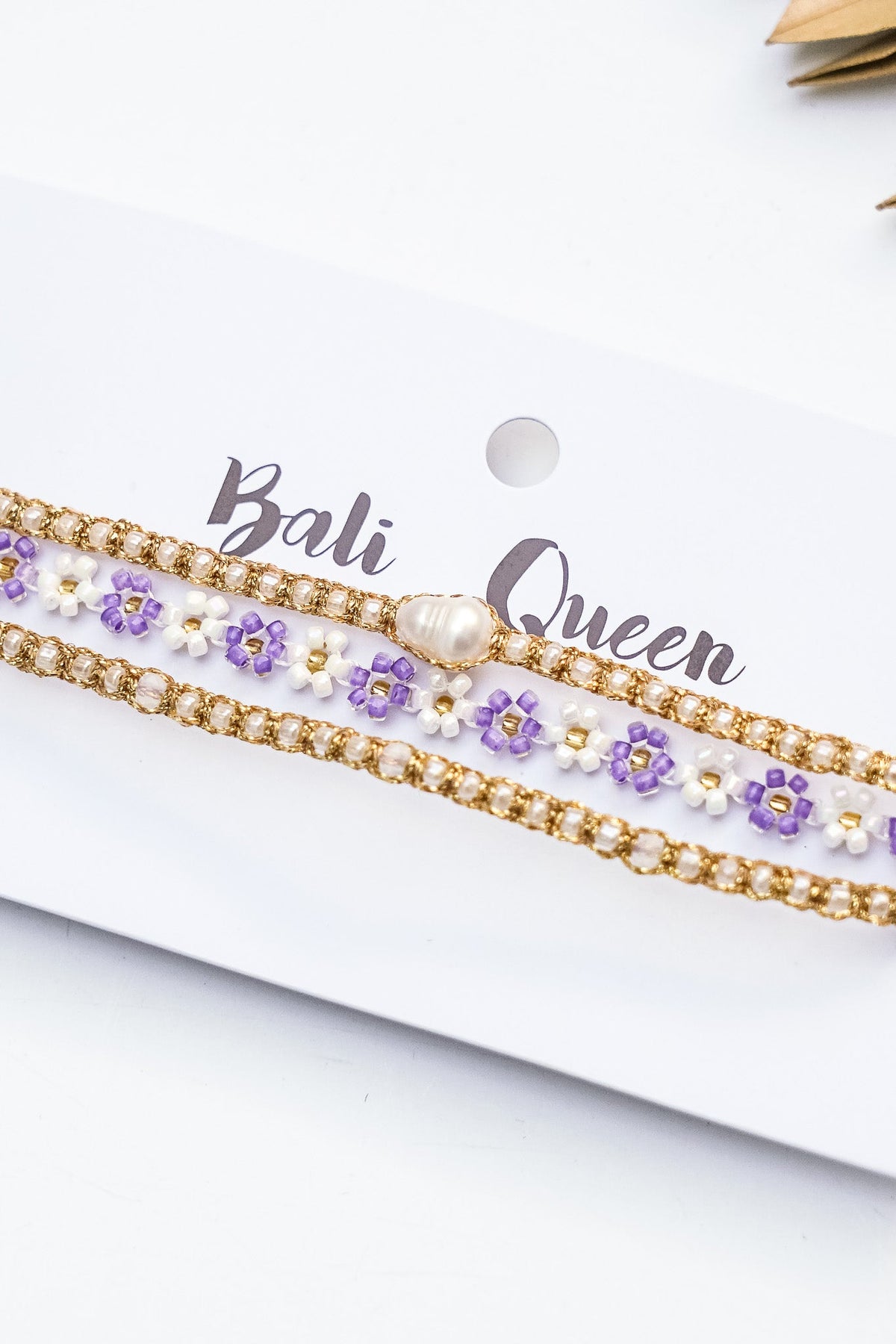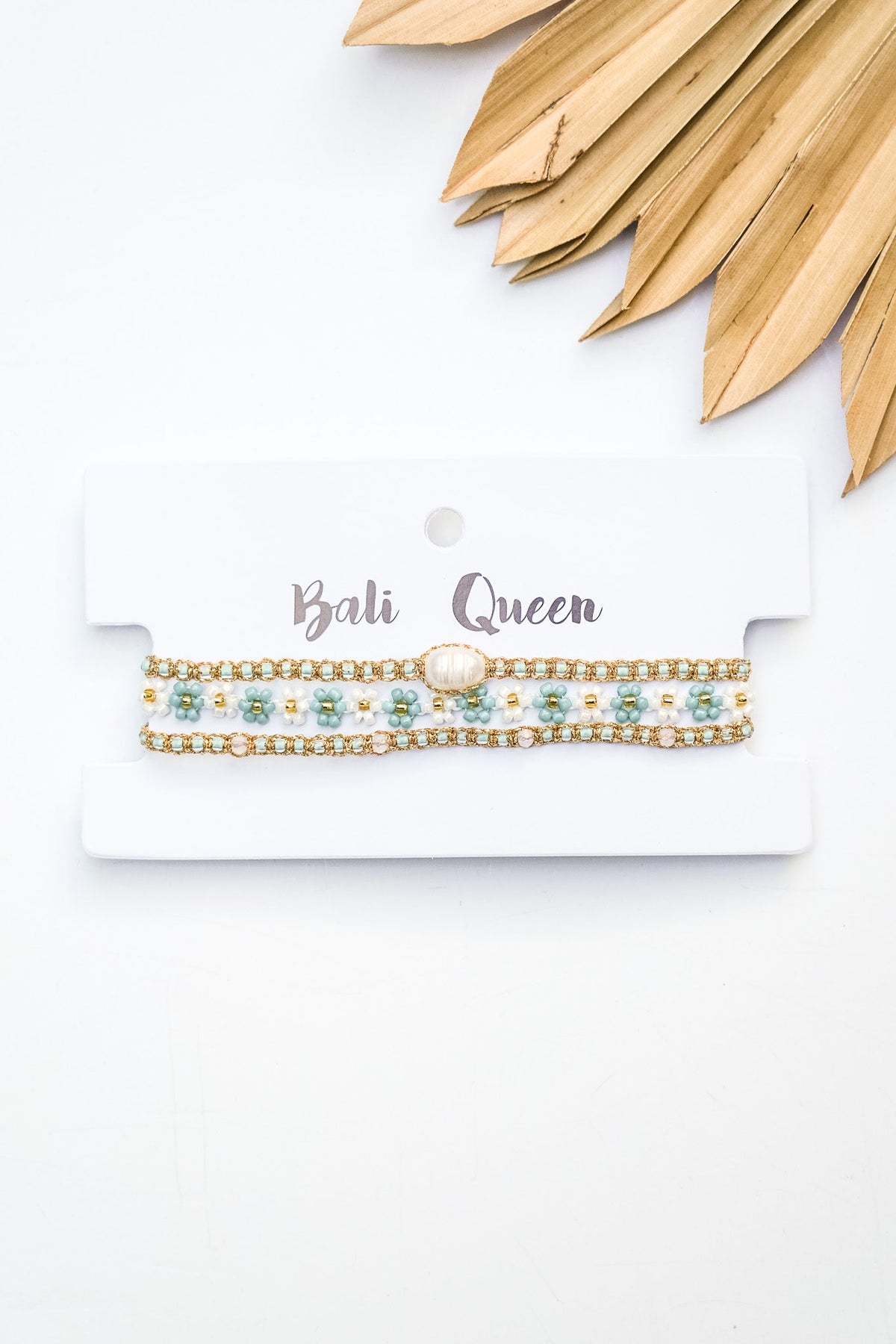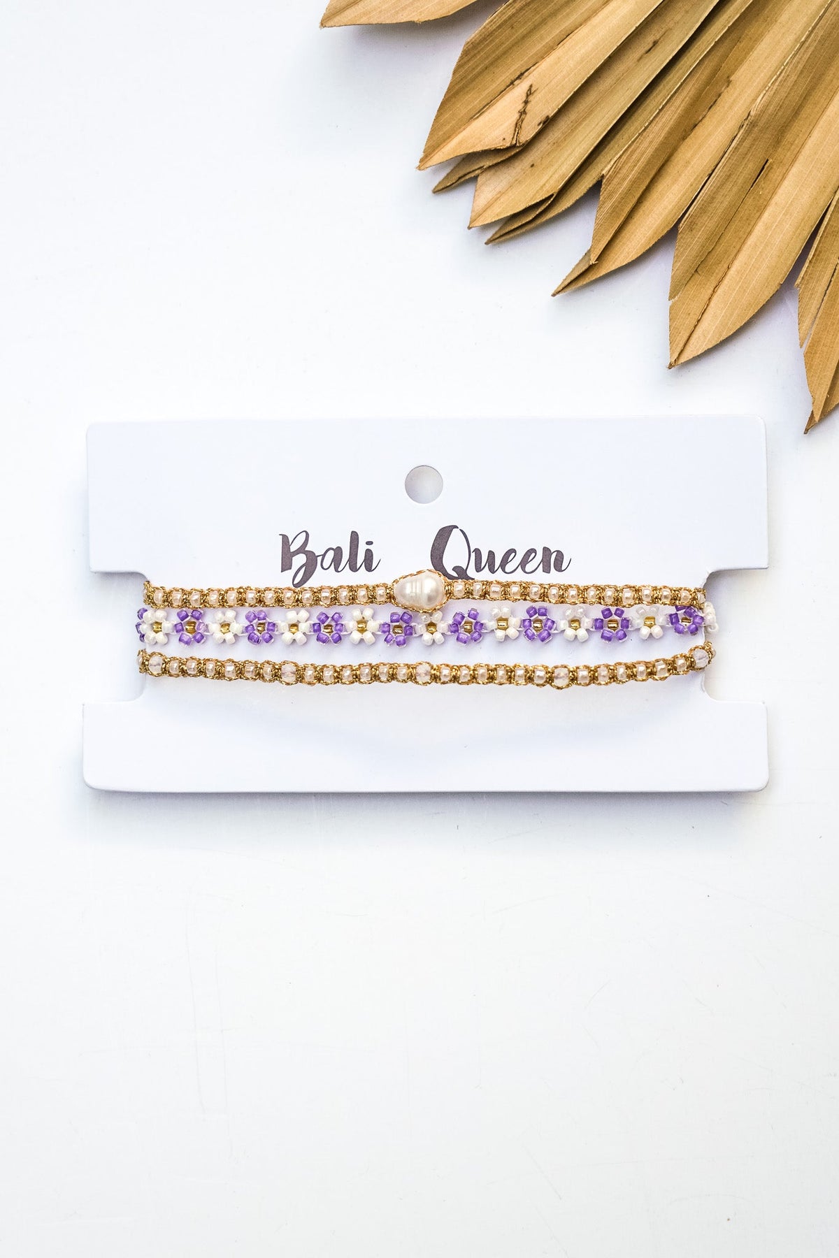 The Daisy Mae Pearl Bracelet Pack includes three unique bracelets woven on gold cord. One bracelet features a central pearl bead, while the middle one showcases charming daisy-shaped seed beads. The last bracelet is a vibrant mix of colorful and white beads, perfect for stacking or wearing individually!