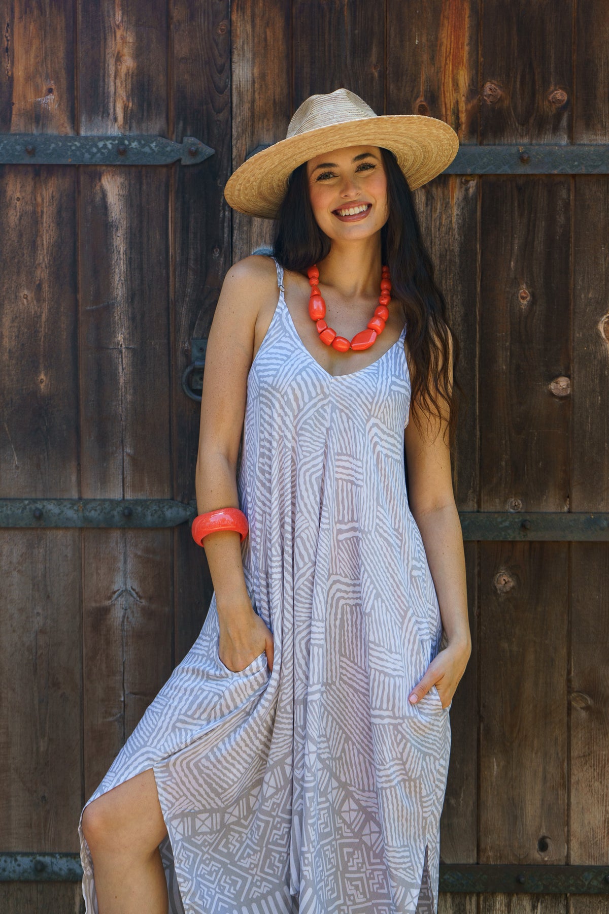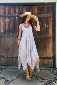 The Mojave Genie Dress is breezy, bohemian, and made to move. With its flowy silhouette, shark-bite hemline, and playful sway, this dress is perfect for barefoot afternoons by the water or dressed up for a night under the stars. The artisanal Mojave print adds a touch of island mystique, making it a standout in any resort wardrobe.