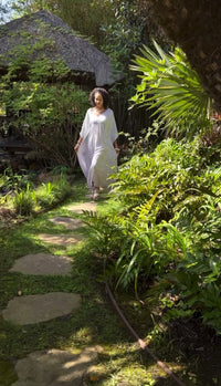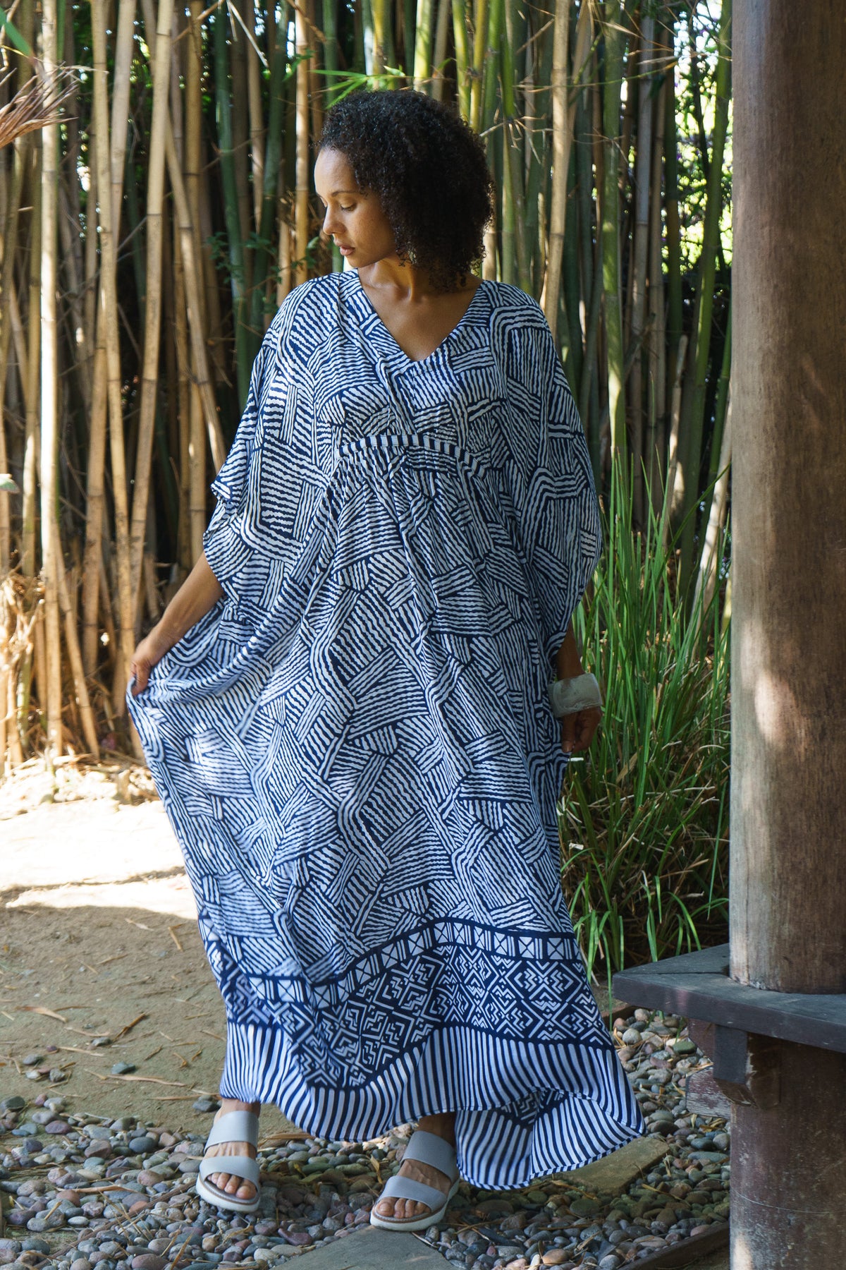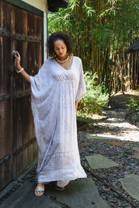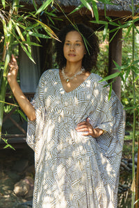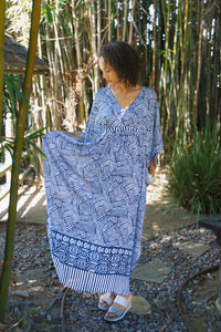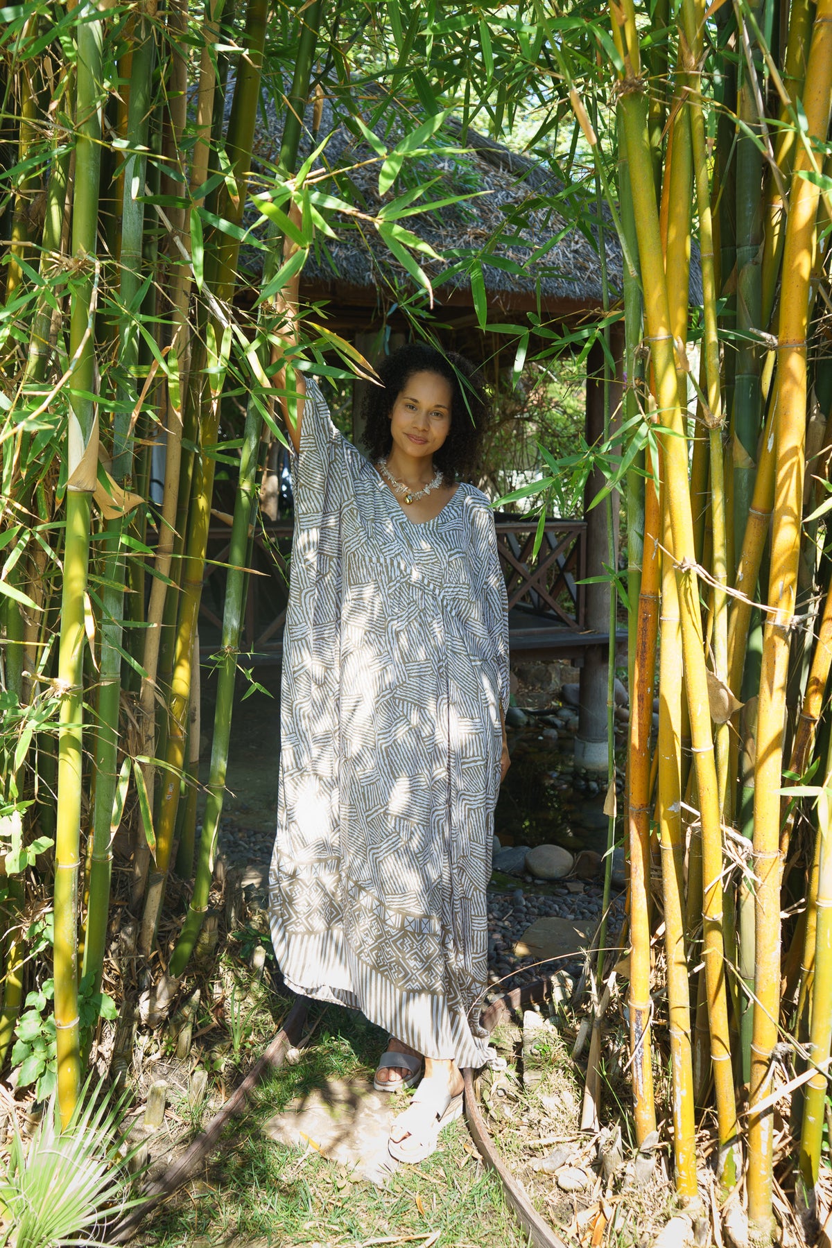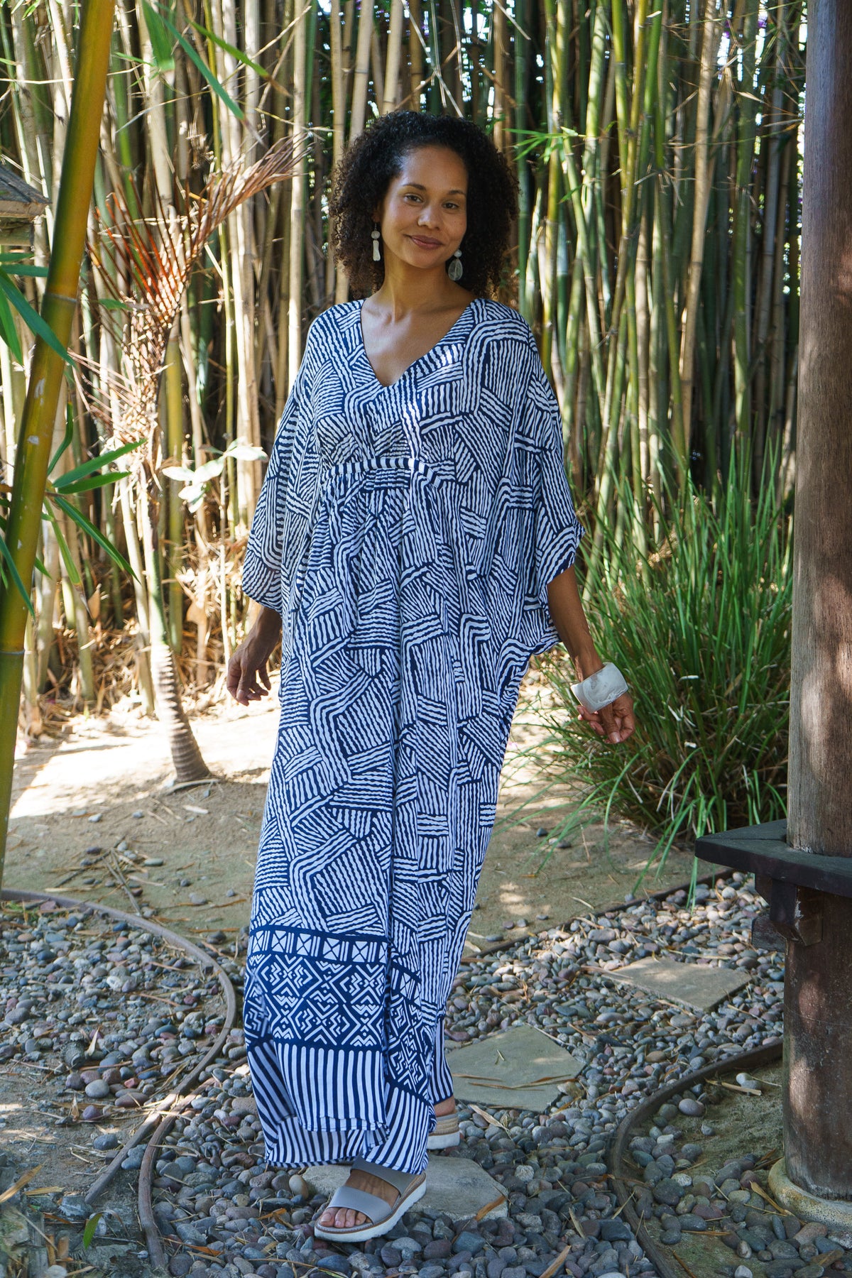 Dramatic and free-spirited, the Mojave Cinched Long Caftan is made for those who love making a statement with ease. With its flowing silhouette and deep neckline, this longline caftan drapes beautifully whether layered or worn solo. The lightweight rayon fabric makes it perfect for warm destinations and effortless resort styling.