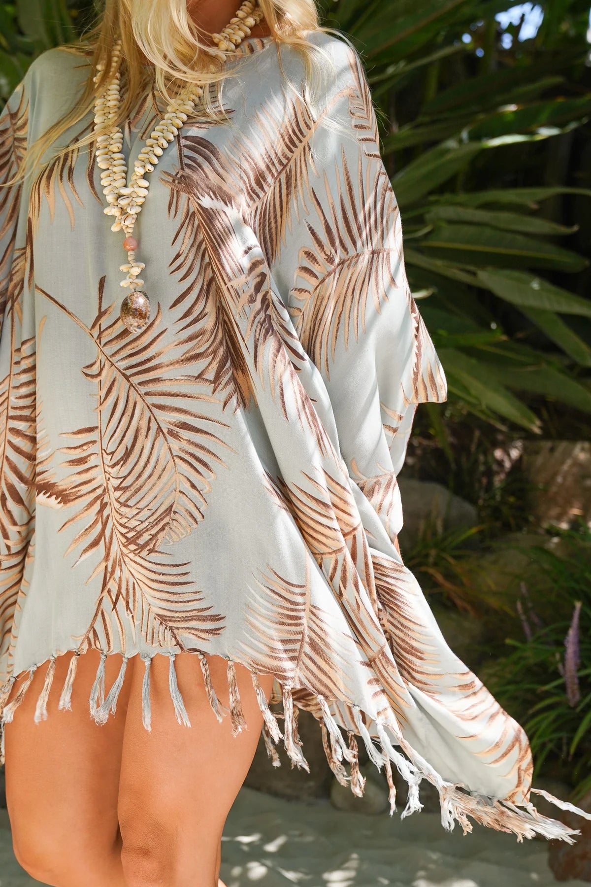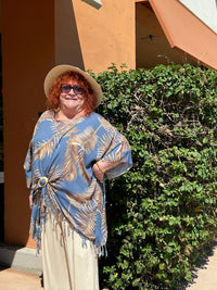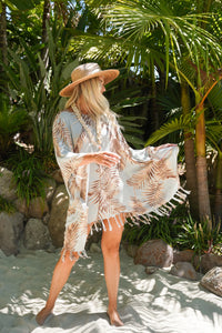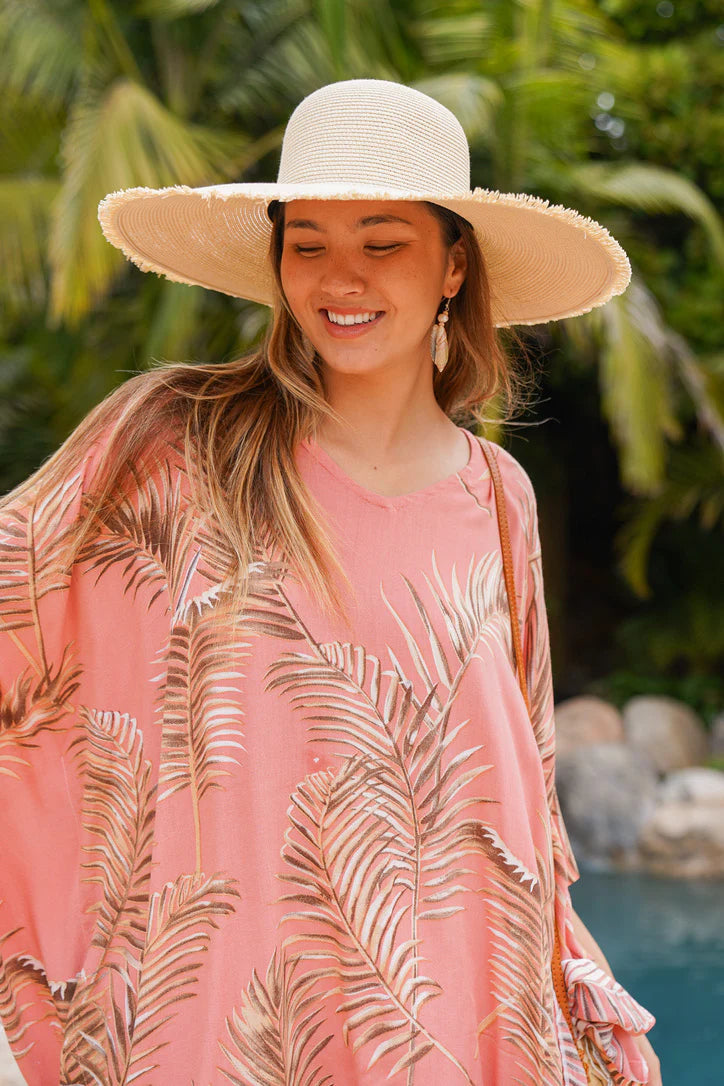 The Coco Beach Caftan takes you to a coastal place—with a neutral palm print, gorgeous colorways, and a lightweight, breezy material that makes every day feel like a breezy coastal destination.