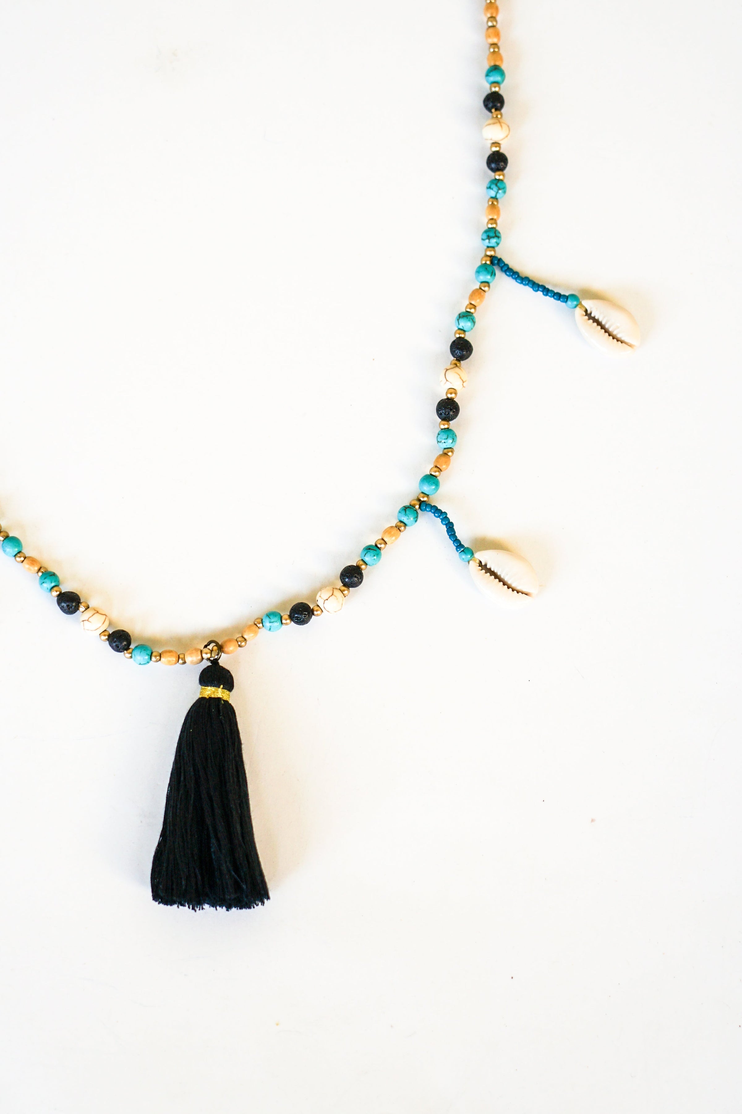 A bold mix of cowrie shells, lava stone, wood, and turquoise beads—earthy textures and ocean hues come together in a piece made for sun-chasing and saltwater days.
