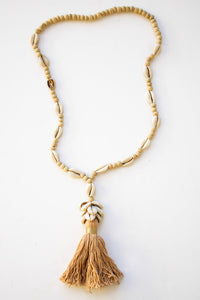 A coastal-inspired design featuring natural wood beads, cowrie shells, and a playful tassel accent. Perfect for adding a breezy, beachy touch to any outfit.