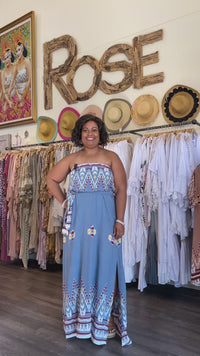 This strapless maxi dress features a side slit for added flow and versatility, with a removable tie to customize the fit. Designed with hidden pockets for practicality, it offers a perfect blend of style and comfort.