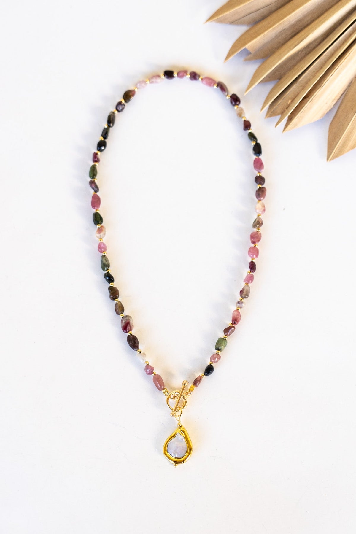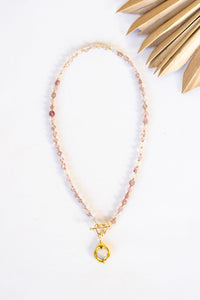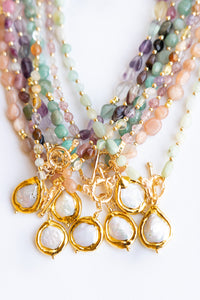 This refined lariat necklace features a single freshwater pearl nestled among smooth beach pebbles, all brought together with a toggle closure. A simple yet striking design that adds a coastal-inspired touch to any outfit.