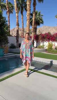 Introducing our Bombay Jeweled Caftan. Featuring intricate beading throughout the neckline, this caftan is crafted from a luxurious viscose silk blend. The SharkBite hem adds a unique touch, making it a standout piece.