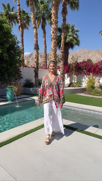 Introducing the Bombay Jeweled Top, embellished with intricate beading throughout the neckline. Crafted from a luxurious viscose silk blend, this top features elegant bell sleeves and a unique shark bite hem. Perfect for adding a touch of sophistication to any outfit.
