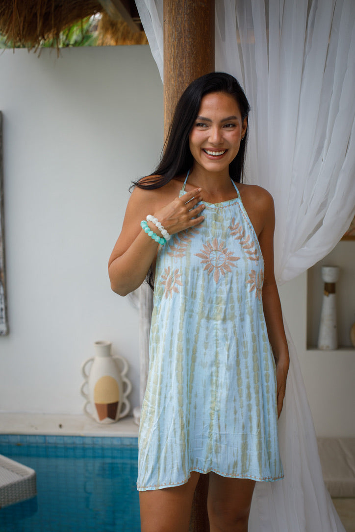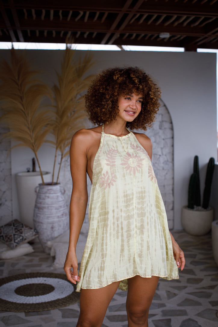 Playful, radiant, and made for sun-soaked escapes, the Sunburst Mini brings effortless charm to warm-weather dressing. A delicate sun-inspired motif highlights the neckline, while the open-back halter design adds an alluring, carefree finish.